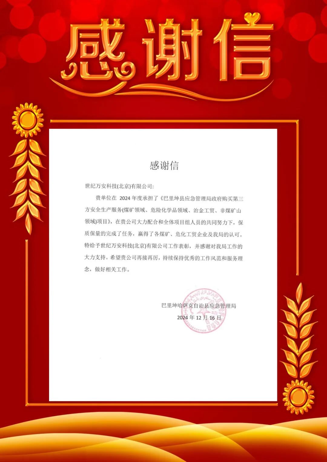 世紀萬安公司助力巴里坤縣安全生產提升 應急管理局致函感謝